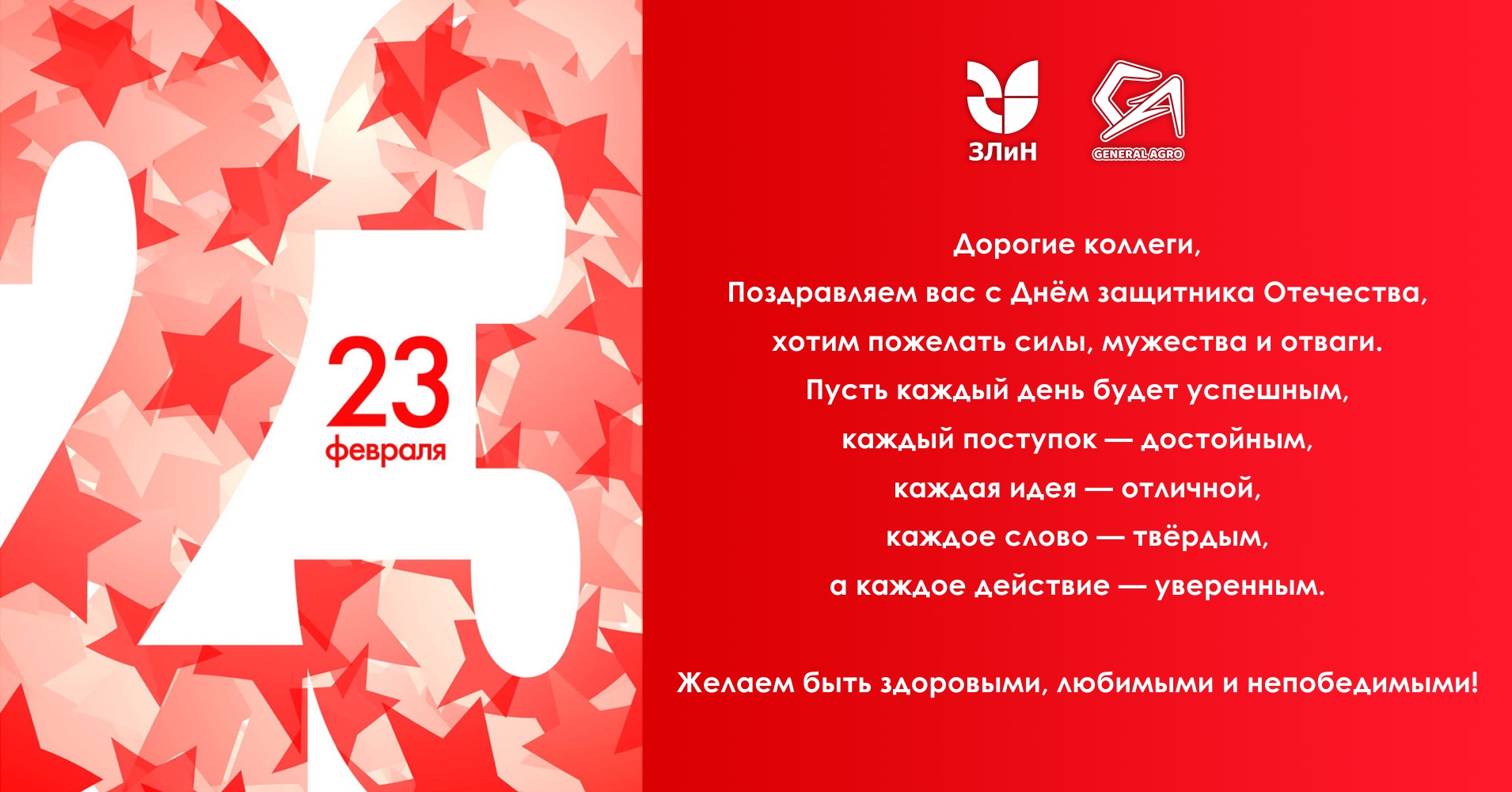 Дорогие друзья, коллеги и партнеры. Коллектив ОАО "ГЗЛиН" от всей души поздравляет вас с Днём защитников Отечества! Примите самые добрые пожелания здоровья, долгих лет жизни, мирного неба над головой, упорства, стойкости, железной воли! Желаем верить в себя и всегда добиваться поставленных целей! Успехов вам во всём! Пусть сбудутся все ваши мечты!